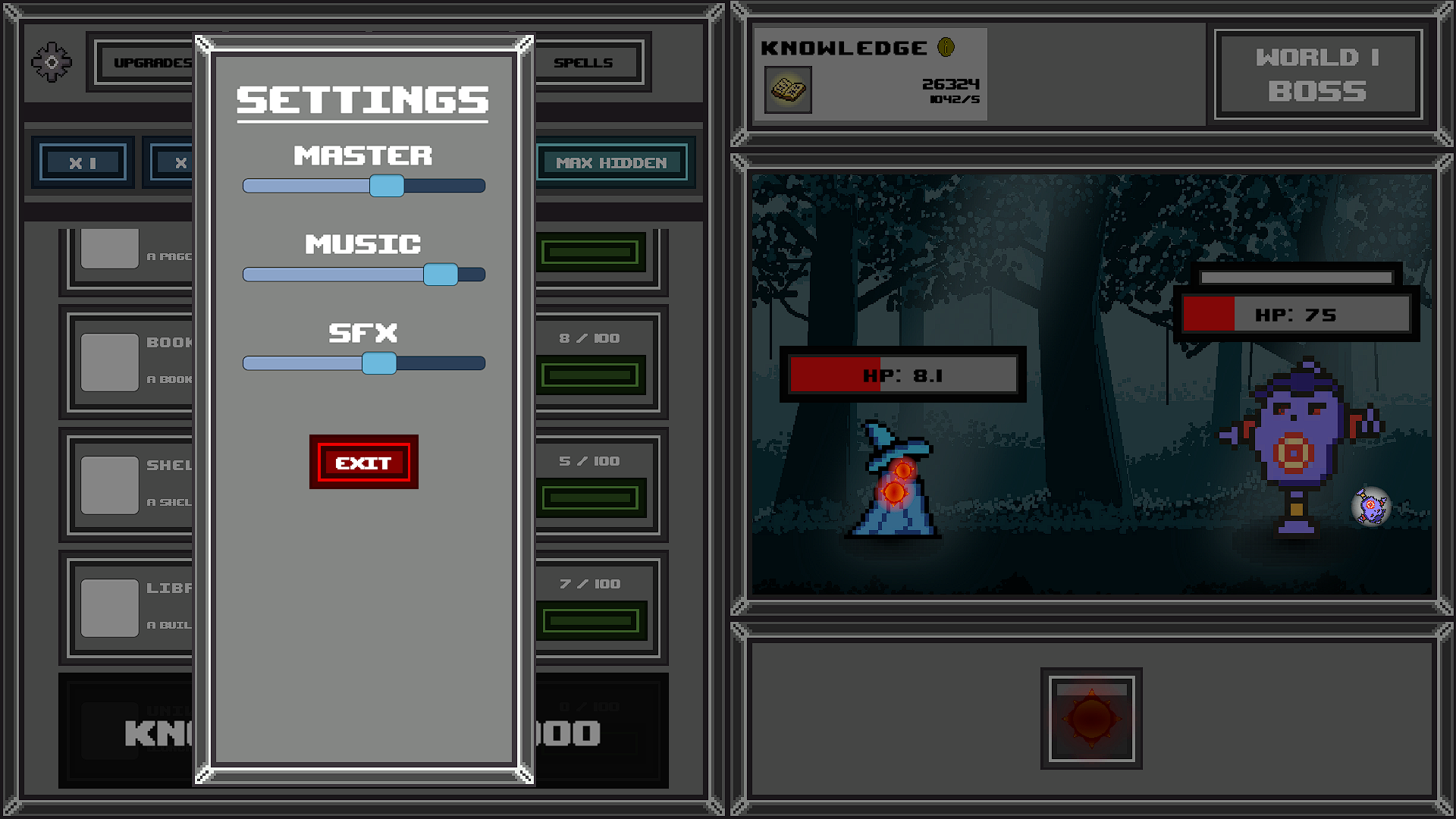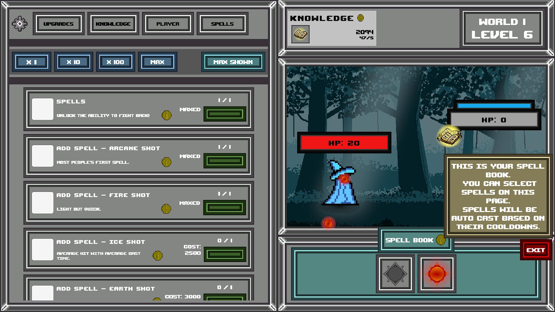 An idle game where you play as a wizard who's trying to gather as much knowledge as possible. Defeat monsters by using the spells and buy upgrades to learn everything there is to learn.